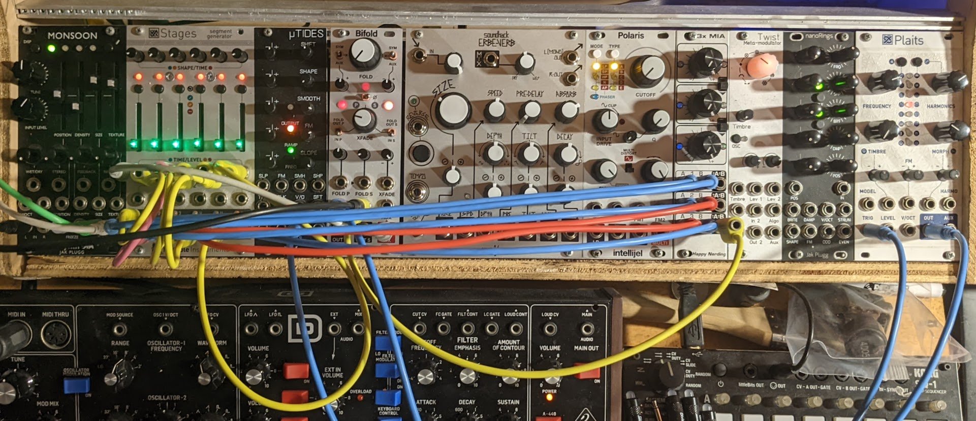 Almost every module in my rack, both those pictured above and those I have available to swap in as needed, can do many things, often at once. From right to left: Plaits offers 16 different synthesis algorithms in one; Rings is a modal resonator and multiFX unit; Twist (based on Warps) is 8 different effects based on two signals’ interactions, as well as 8 other effects; 3xMIA allows for addition, subtraction, attenuation, inversion, and more; Polaris is 26 different filters with distortion in 1; Erbeverb is a hyper-complex reverb; Bifold is a dual wavefolder and crossfader; Tides is a complex waveshaping envelope generator and LFO; Stages is 6 of whatever you want, from VCOs, LFOs, envelopes, random sources, quantisation, and more; and Monsoon is a granulator with some alt modes built in.