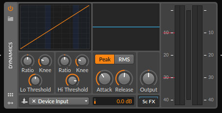 Peak/RMS – Peak compression is what most people think of: the compressor compresses when a peak, like the transient of a kick drum, goes beyond the threshold. However, RMS, or root mean square, compression determines the average volume of input audio and compresses audio to meet that average. In practise, this basically means a low threshold will have a lower output, but dynamic range will largely be preserved.