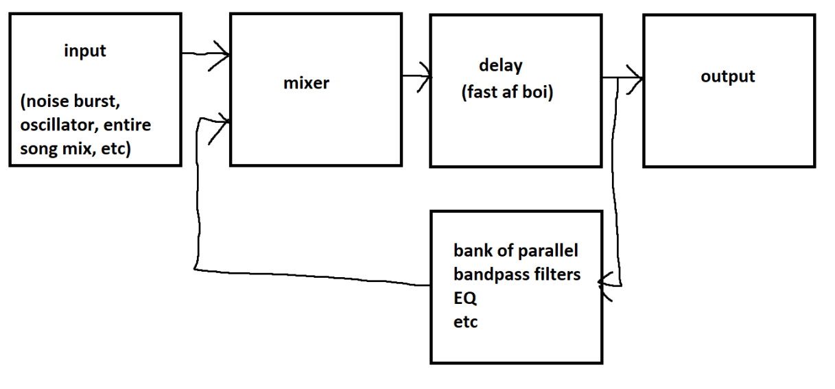 Week 3 of resonators cuz they’re fun! This week, we’re doing the literal exact same thing as last time, except we’re replacing the lowpass filter with a whole-ass bandpass filter bank where each filter has adjustable Q, cutoff, and volume, preferably at least 8 but more is better. This is called a modal resonator, because each filter emulates a mode of a physical object. A mode is where natural resonances meet and determines how an object sounds when it’s struck, like a wooden bar, metal tube, plastic sheet, etc. Modal synthesis is the combination of complex exciter source and modal resonator to create physical sounds (yes, this is a form of physical modelling synthesis).