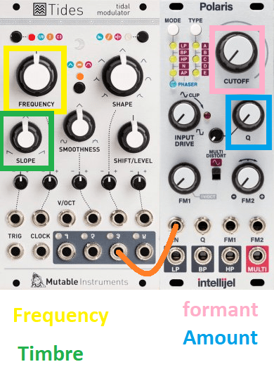 Speaking of twin peaks, if you set both filters to bandpass and run them in parallel instead of series, you can mostly create a formant filter! Set one with a max range of 200-900hz and another to 500-2600hz. Control the cutoffs with a joystick and you’re creating formants! You can use other filter types as well, but you’ll just get more twin peaks stuff and less formant stuff.